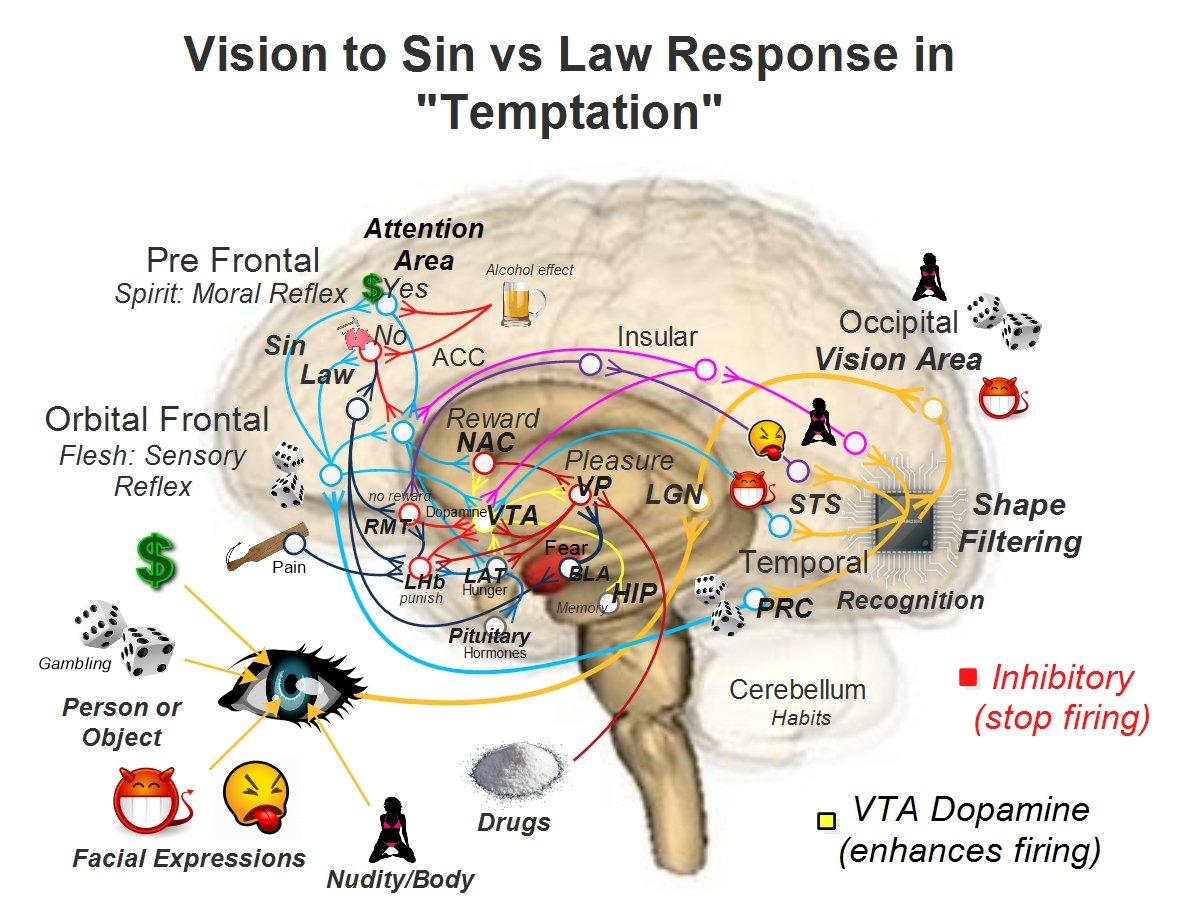 Because we have free will, a Prefrontal Cortex, we have the ability to choose our path in life. Essentially, we set our own Evil vs Good network in our Prefrontal Cortex based on what we believe is good; we wire up connections between the things our senses recognize in our Orbital Frontal Lobe to connections in our Amygdala and Nucleus Accumbens. In the ACC (Anterior Cingulate Cortex) the Prefrontal Cortex (spirit) can inhibit our sensory (flesh) network. Based on what we have set, we become slaves to what we believe in. The good news is that we can modify these connections if we have TRUST in the changes we want to make. The Apostle Paul says this very well here:
